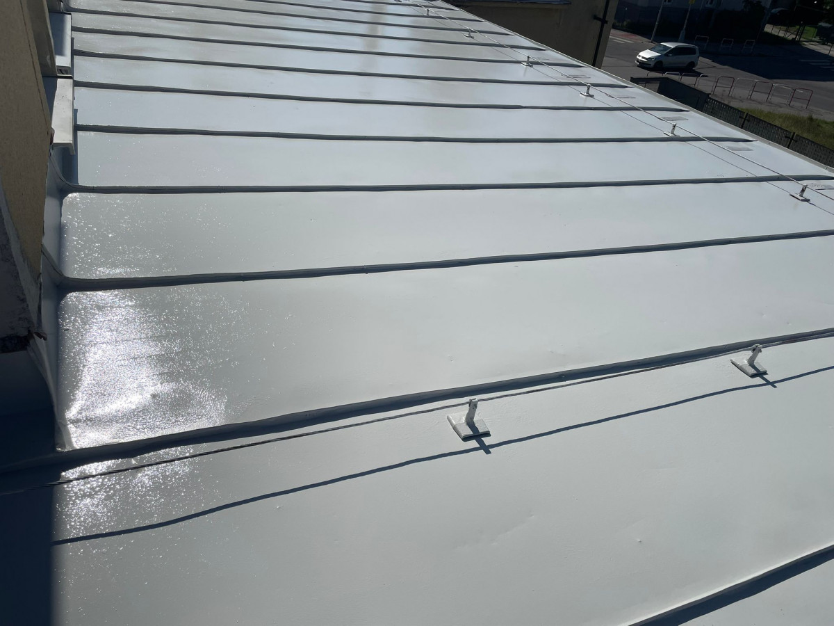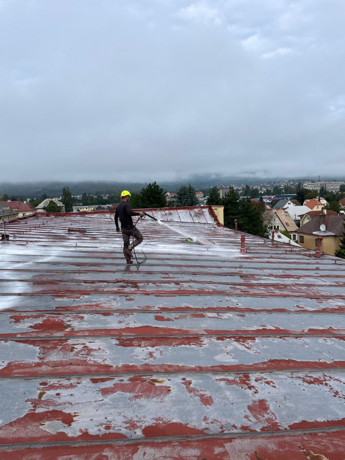 14.08.2025 Búranie komínov Demontáž odvetrávacích komínkov Oplechovanie priestorov, ktoré vznikli pri demontáži odvetrávacích komínkov a komínov Oprava opadanej omietky Čistenie strechy a odstránenie starého náteru vysokotlakovým čističom Vybrúsenie a odmastenie Tmelenie, prelaminovanie a náter